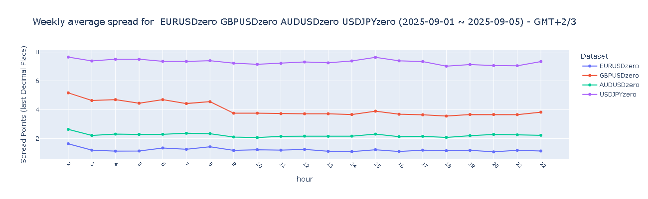 AUDUSD (Australian Dollar) while maintaining good spreads (2–3 points) across the Asian, European, and US sessions. suggesting stable but slightly varied performance.