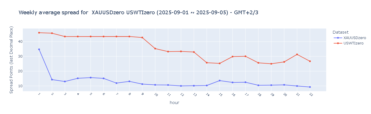 XAUUSD (Gold) maintained good spreads (10–15 points) during the European and US sessions, while spreads widened to Average (15–20 points) in the Asian session. indicating less favorable conditions outside peak hours.