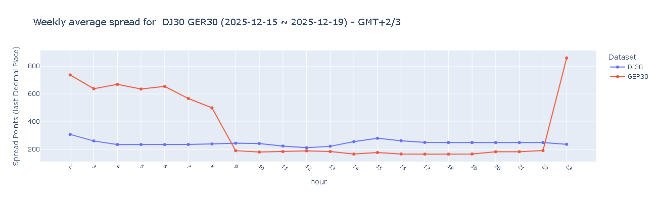 GER30 (German 30 Index) achieved Excellent spreads (100–200 points) during the European session , while spreads widened to Good levels (200–300 points) in the US session . During the Asian session , spreads deteriorated to Improvement Required levels (>500 points) , highlighting strong sensitivity to time-zone liquidity.