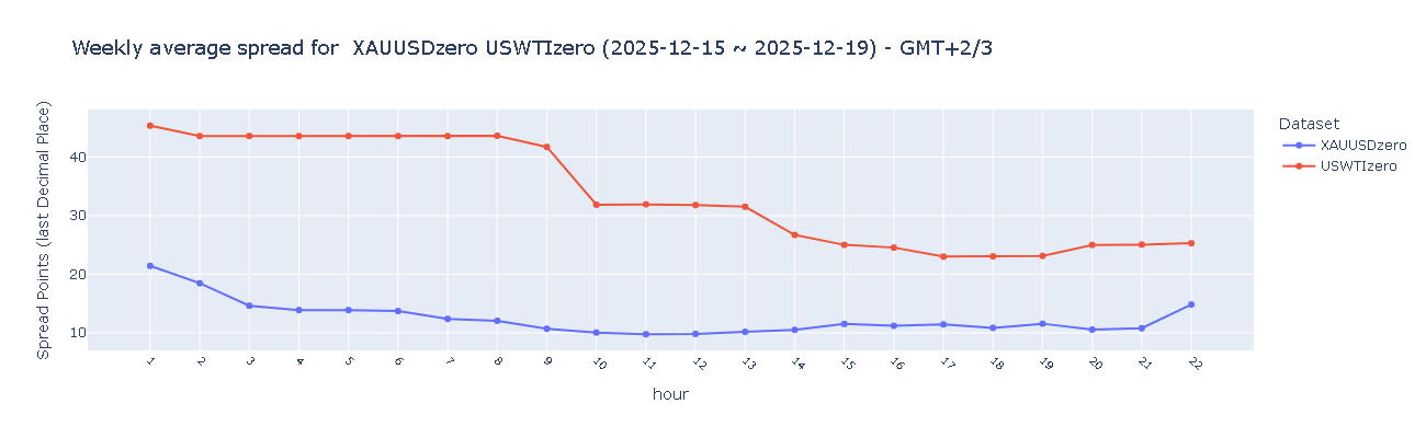 USWTI (US Crude Oil) offered Excellent spreads (20–30 points) during the European and US sessions , while spreads widened to Average levels (40–45 points) in the Asian session , reflecting reduced liquidity during off-peak trading hours.