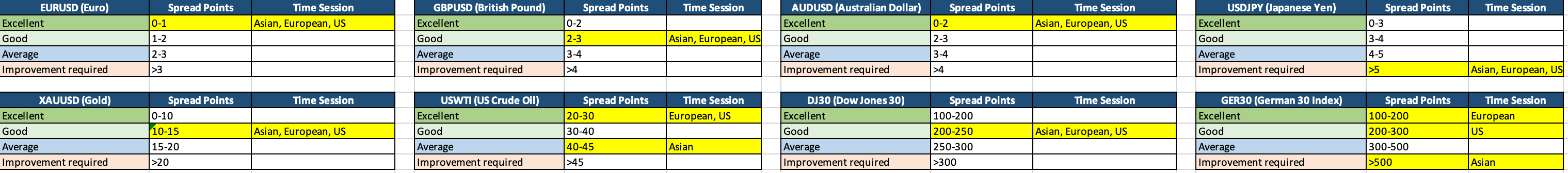XAUUSD (Gold) maintained Good spreads (10–15 points) across the Asian, European, and US sessions .