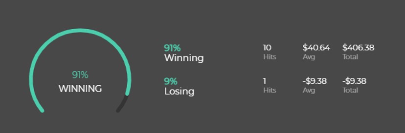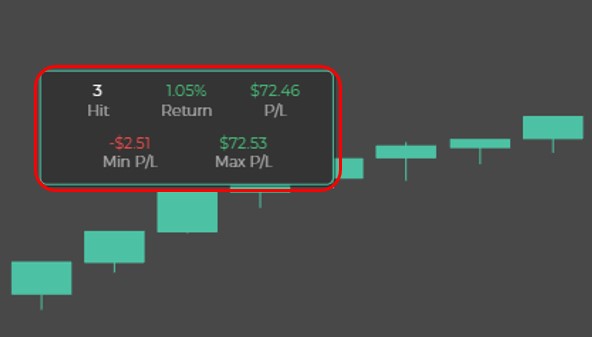 这边回过头来补充一下,Capitalise.ai绩效走势图并非是单纯的线条,而是由一个一个像是K线的东西所组成。绿色实心K线代表该笔交易是获利的,而白色空心K线则表示该笔交易产生亏损。我们透过将鼠标放在第三个K线上(也就是第三笔交易),将看到如下图三的资讯。可发现这笔交易的获利百分比是占了下单金额的1.05%,而最终损益为72.46,过程中最大亏损为-2.51,过程中最大获利为72.53,可以简单理解为下影线的端点就是最大亏损,而上影线的端点就是最大获利。