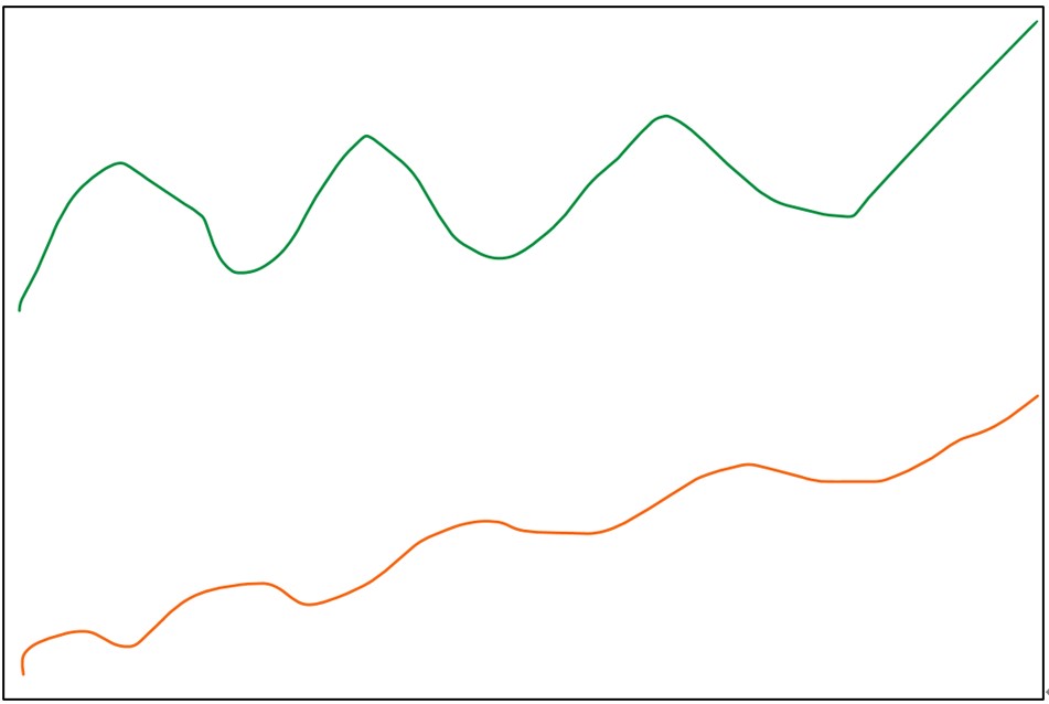 如果再更深入讲究,则会去观察曲线走势的平稳程度。以下图二當中的两条绩效曲线为例,交易笔数与最终获利金额都相同,聪明的各位应该都会知道橘色的绩效曲线是比较优秀的,因为它在这个过程中回档的幅度较小,以交易者的心理层面来说,比较能够在实盘交易中坚持运行该策略;反观若是绿色曲线,单看获利好像与橘色曲线一样,然而实际交易的过程中,绩效回档过深,这就意味着遭遇到连续亏损,往往让交易者无法坚持执行策略而暂停,等到发现模拟策略绩效又创新高的时后,又开启实盘,这时往往又遇到绩效回档,然后又暂停策略…,进到一个恶性循环当中
