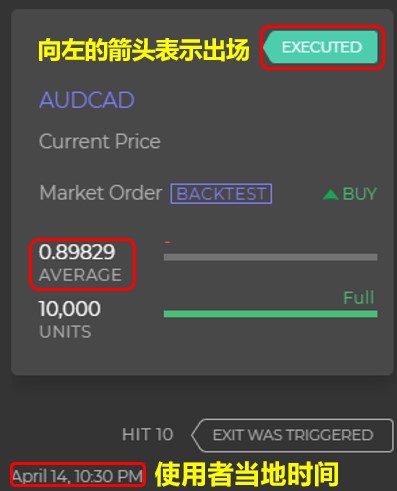 同样的我们以图七为例,如果第10笔交易已经出场,你将会看到类似进场的出场交易明细。同样的,我们可以看到在台北时间的晚上10点半出场规则被触发。出场的价格为0.89829,各位应该有发现跟刚刚图六右上方的价格几乎是一样的,这就表示如果该笔交易已经出场,代表出场的价格将会同时显示在进场与出场的交易明细。
