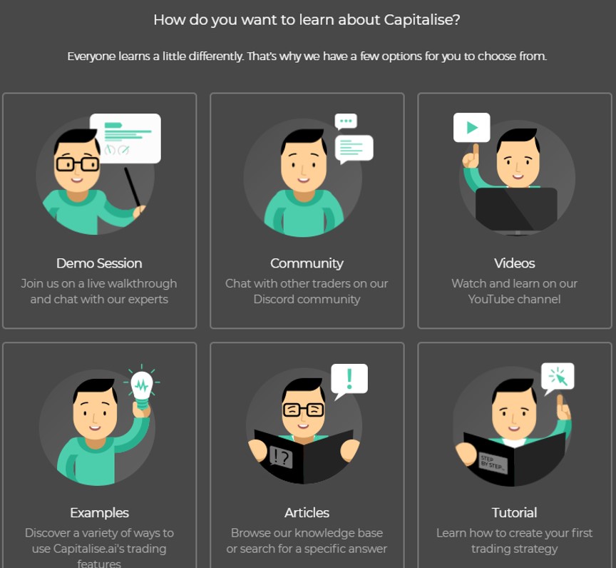• 进入后画面如下图四,此区则是把学习Capitalise.ai的资源汇整在一起,您可以约定Capitalise.ai讲师教您如何运用他们的工具、去Youtube、Discord获取最新学习影片与资源,同时把相关的范例、文章及常见问题都统整在这个地方了。想系统性学习Capitalise.ai的投资朋友不容错过!