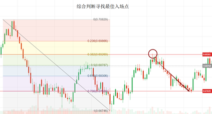 如图所示,我们选取澳元7月初行情高点作为波段高点,连接8月底形成的长下引线K线最低点为波段低点。随着行情的运行,澳元出现第一波小幅上涨波段,并且该波段连续受阻于斐波那契0.5阻力位,随后出现了二次探底行情。 见证这个过程的小伙伴可能会惊叹斐波那契工具的准确性,但是行情走出以后才清晰看到整个价格的运行轨迹,并不能给你带来利润。不过,我们还可以继续跟踪行情的运行,寻找二次入场的机会。