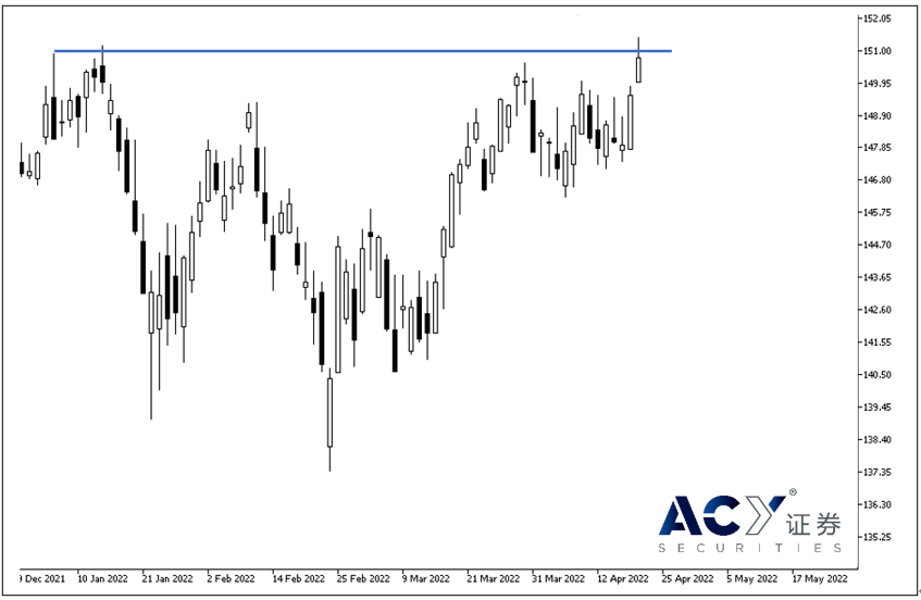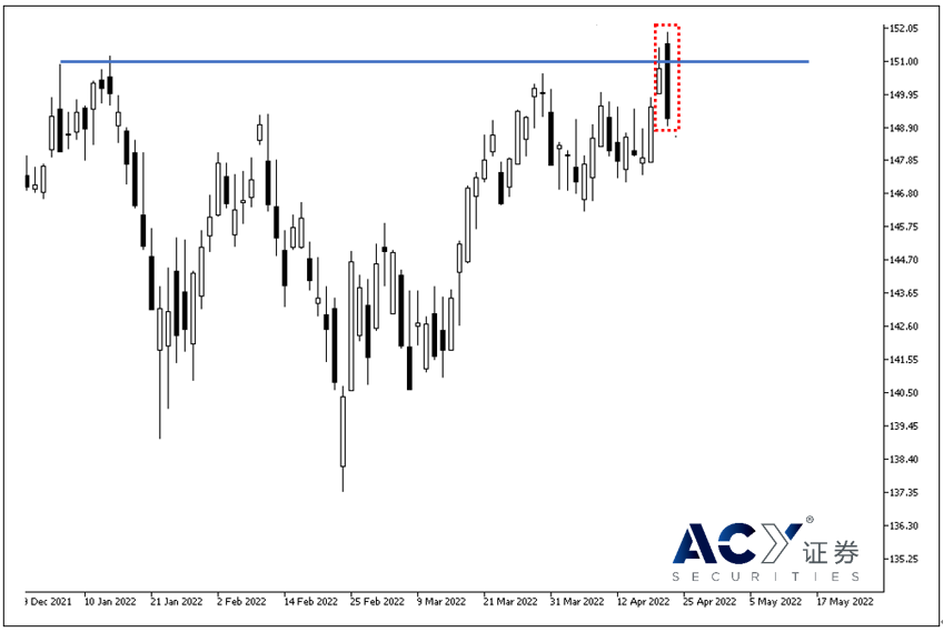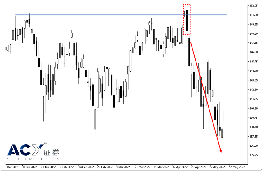 在上图一,我们发现价格来到约151的压力区,然而此前的上升的态势依然持续着,这时不应该贸然进场做多,聪敏的交易者这是应该等待形成反转的K线形态才去做空,否则很容易在上升的行情中作空而受伤。