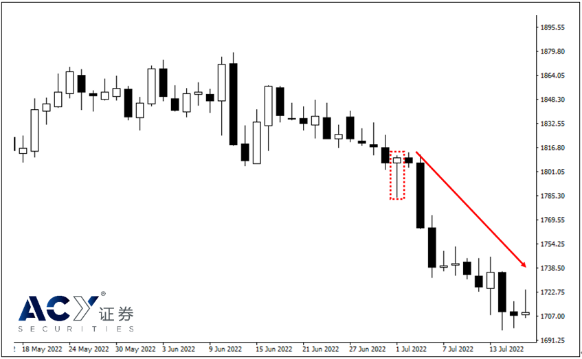 交易者的耐心让他等到了我们之前有提过的空头K线形态,这是一个潜在的反转做空形态,交易者在设定相应的止损之后,可以考虑进场做空。让我们来看看后势行情的发展。