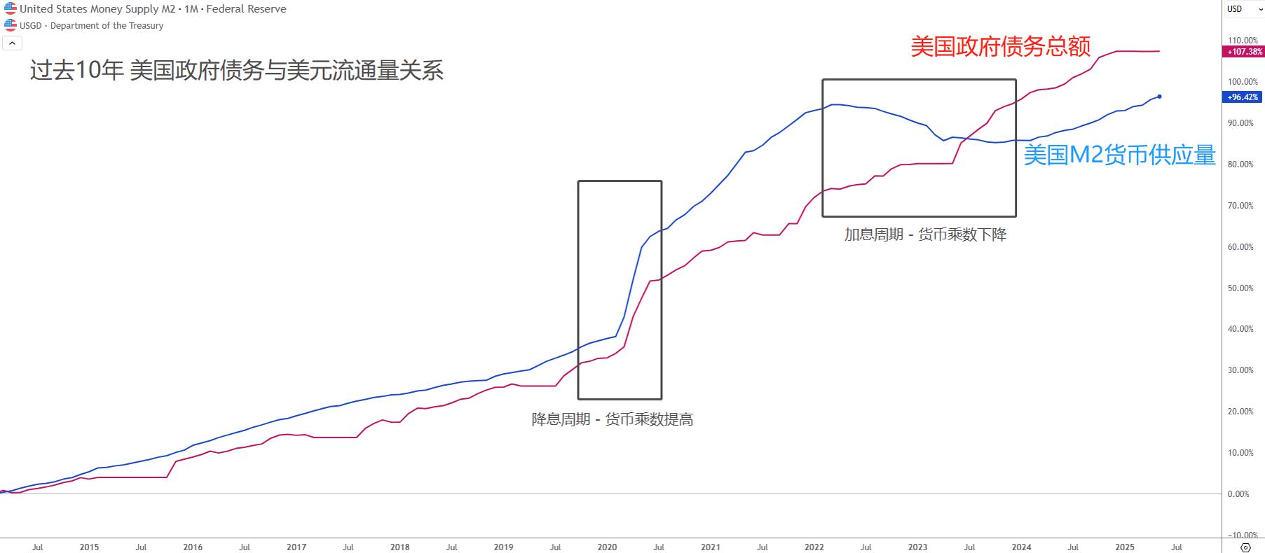 从数据也能看出这一趋势。美元M2与美国政府债务总额的长期关系表明,财政纪律的松散正在持续推高美元的流通量。过去十年,美国政府债务翻了一倍,美元M2也同步翻倍,物价水平更是上涨逾一倍。