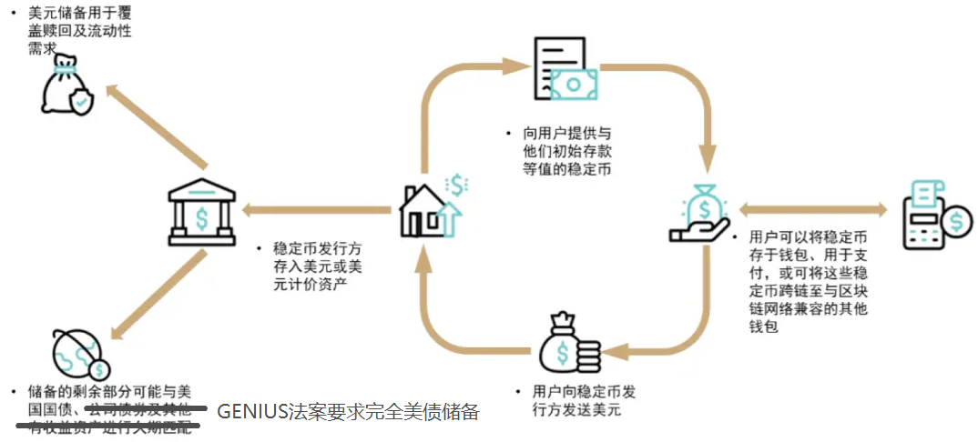 稳定币与商业银行的负债端功能相似:储户将美元交给发行方,发行方向其发行稳定币凭证,并以美元投资短期国债赚取利息,相当于替代了商业银行的吸储功能。