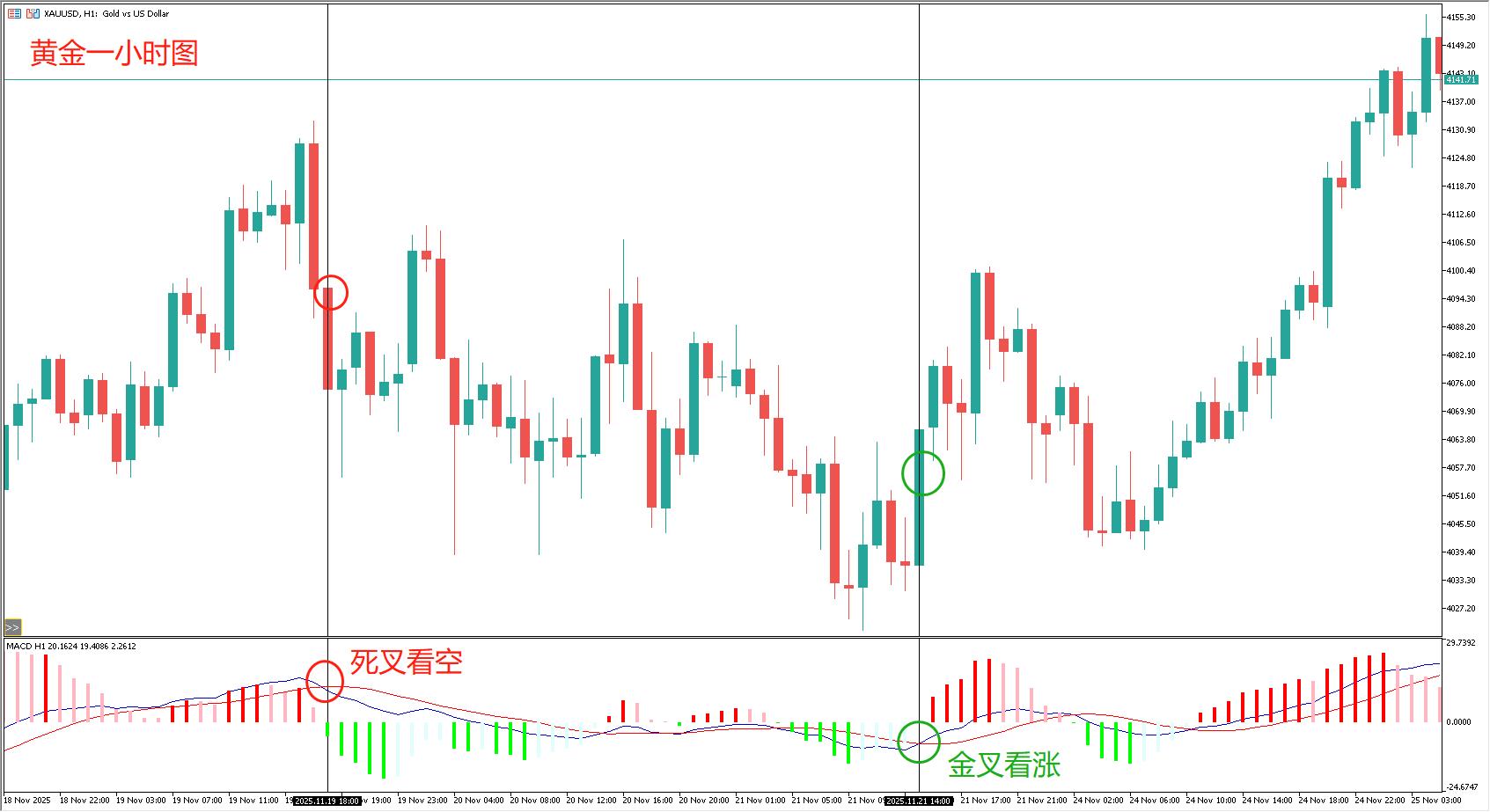 以ACY证券MT5平台的黄金一小时图为例,在MACD形成死叉后,黄金价格保持下跌;而在MACD形成金叉后,金价便触底反弹。需要注意,尽量配合零线下方的死叉看空,或零线上方的金叉看涨,这样的胜率更高。原因就在于零轴能够决定方向趋势。