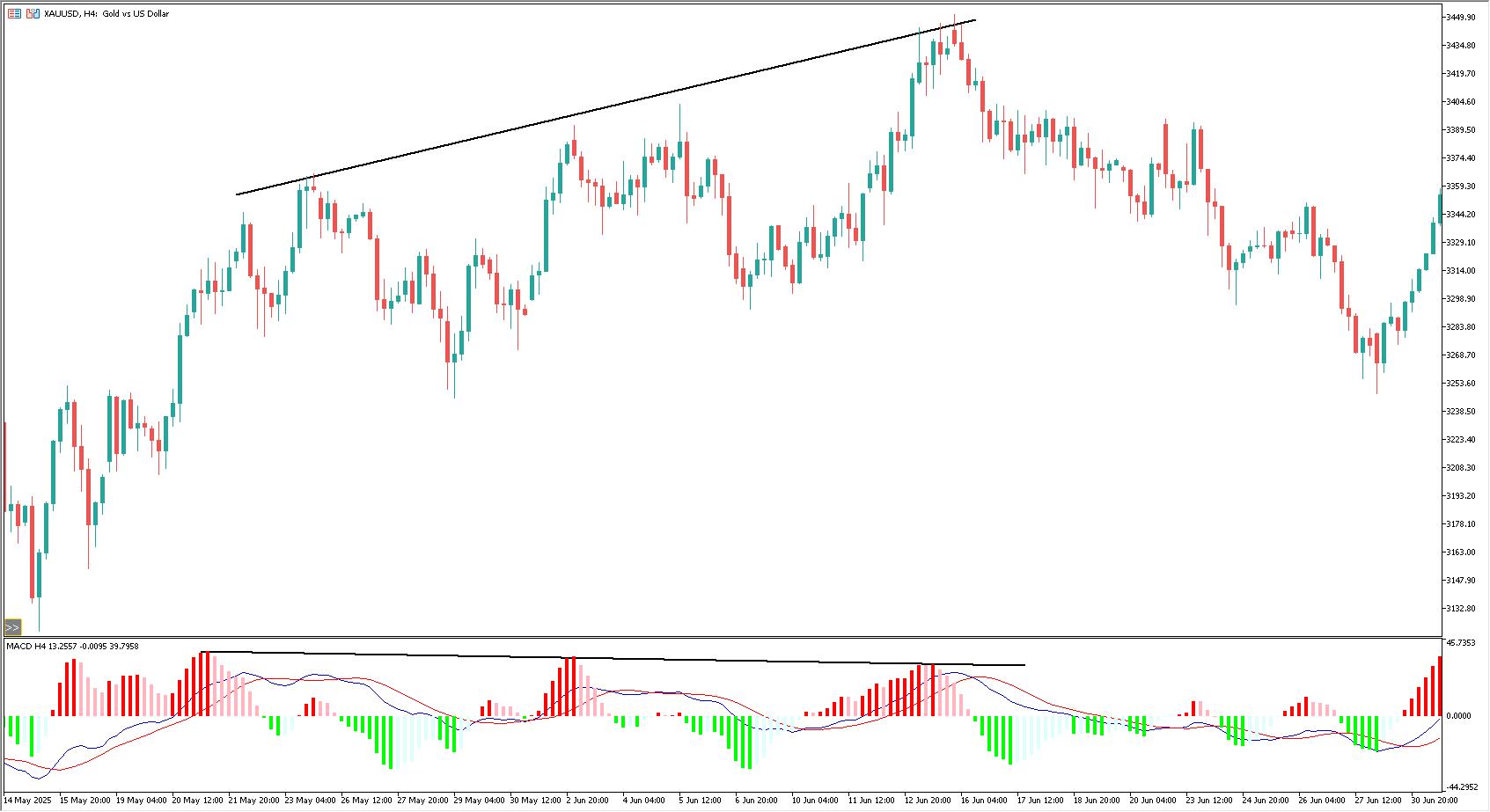 同样以ACY证券MT5平台黄金兑美元四小时图为例,在金价不断上涨并创新高的同时,每次新高所伴随的MACD DIF柱线却在逐渐下滑。但MACD形成三重顶背离的时候,黄金的价格停止上涨,并开启一波较大幅度的回调。