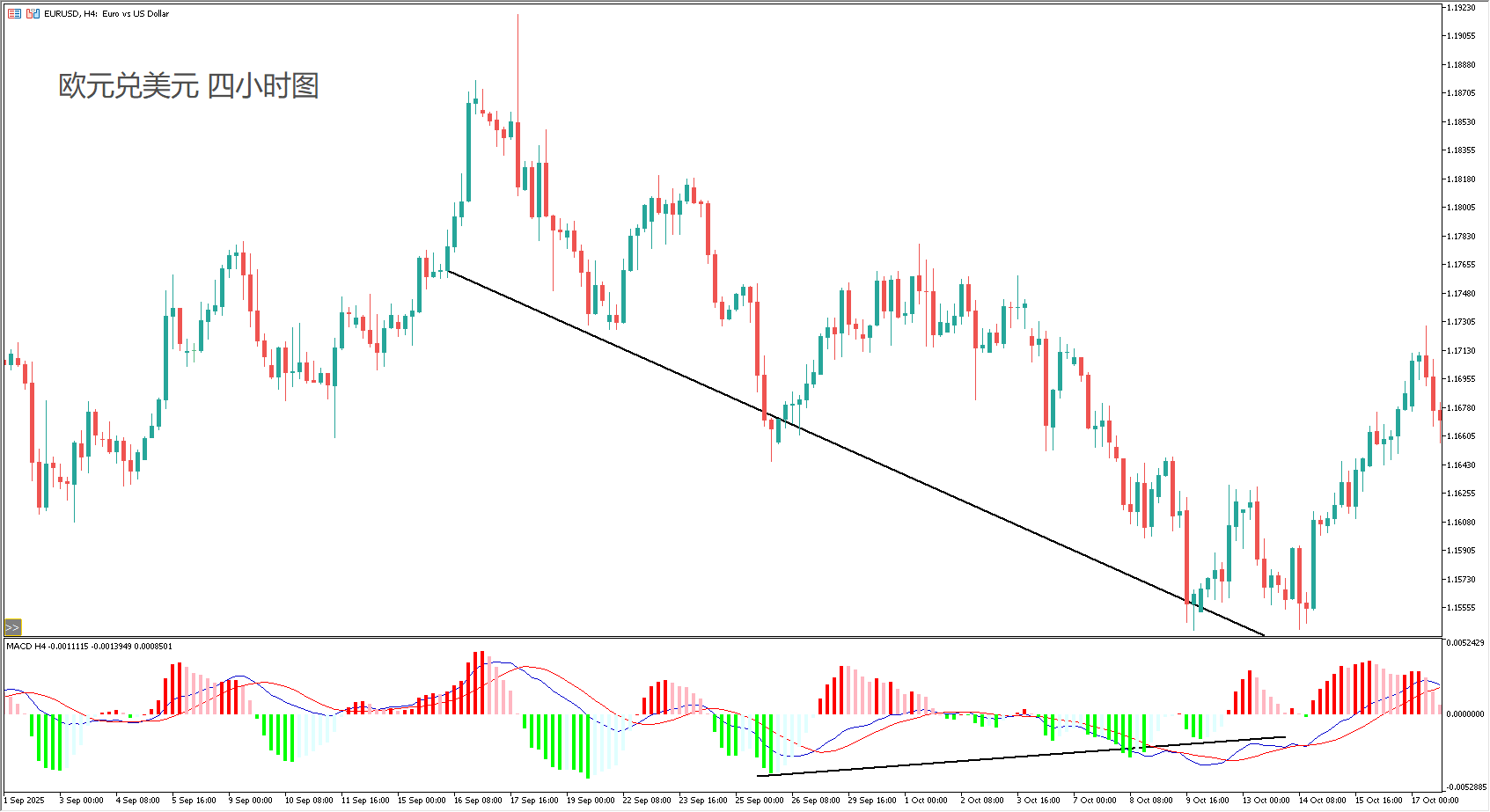 以ACY证券MT5平台欧元兑美元四小时图为例,在欧美汇率持续下跌并屡创新低的同时,MACD的DIF柱线的低点却在反弹,说明价格下跌的动能正在逐渐减弱。因此当MACD形成双重底背离后,欧美汇率触底反弹,持续上涨。