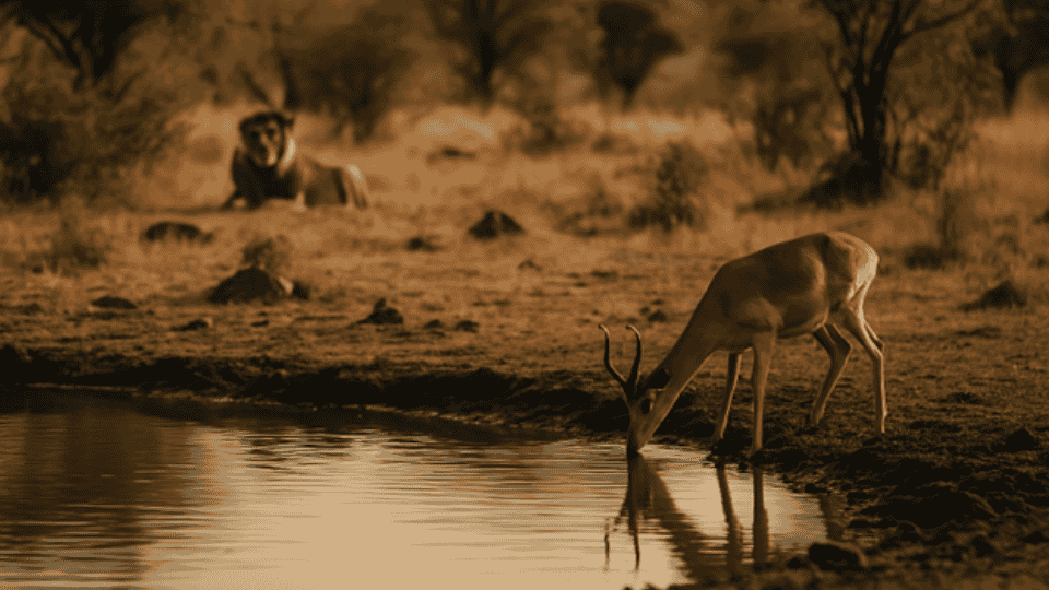 而是埋伏在水源附近——因为鹿一定会来这里。