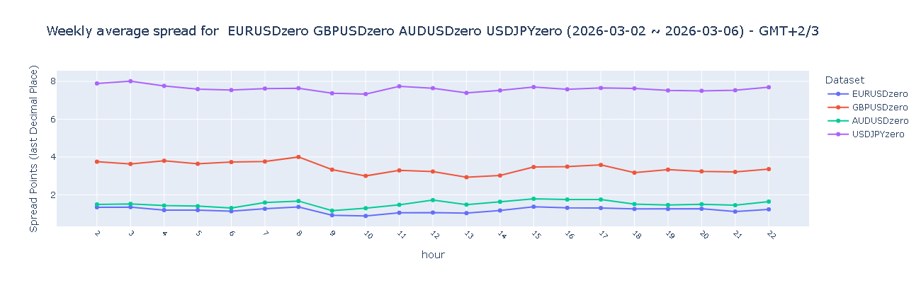 GBPUSD(英镑/美元)在亚盘、欧盘及美盘时段均录得"平均"水平(3–4点)。这反映出与其他主流货币对相比,该品种的交易成本相对偏高。