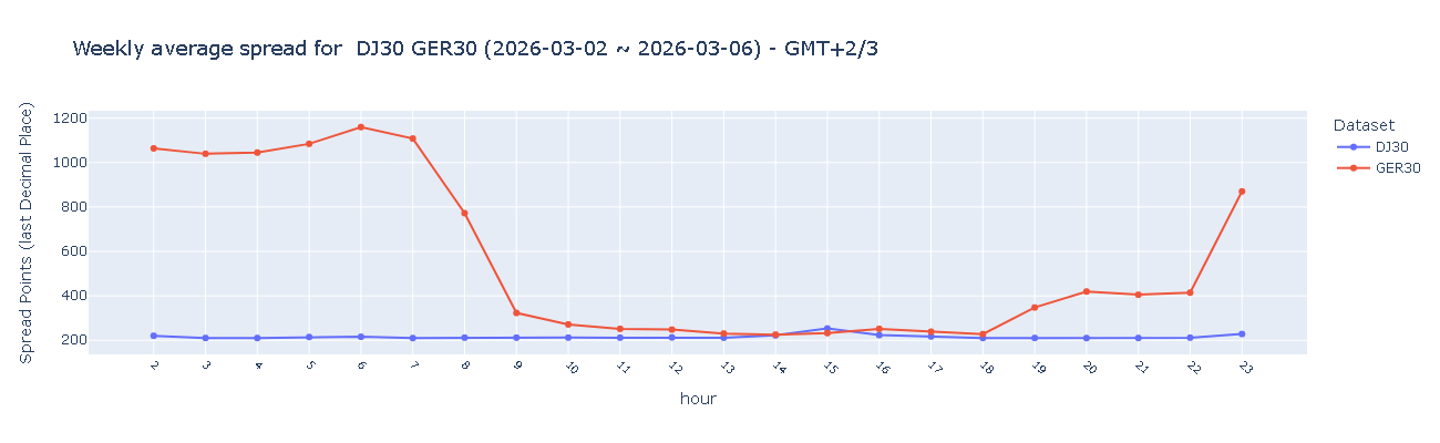 GER30(德国30指数)在欧盘时段录得"良好"水平(200–300点),美盘时段点差扩大至"平均"水平(300–500点),亚盘时段则进一步恶化至"需要改进"水平(>500点),充分凸显该指数对不同时区流动性变化的高度敏感性。