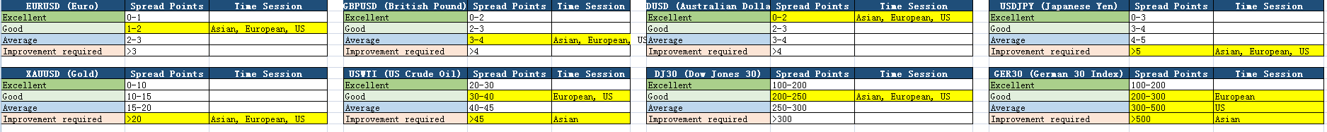 USDJPY(日元/美元)在亚、欧、美全时段均表现为"需要改进"(>5点),凸显了该品种在各时区内点差偶有走阔及较高交易成本的持续性问题。