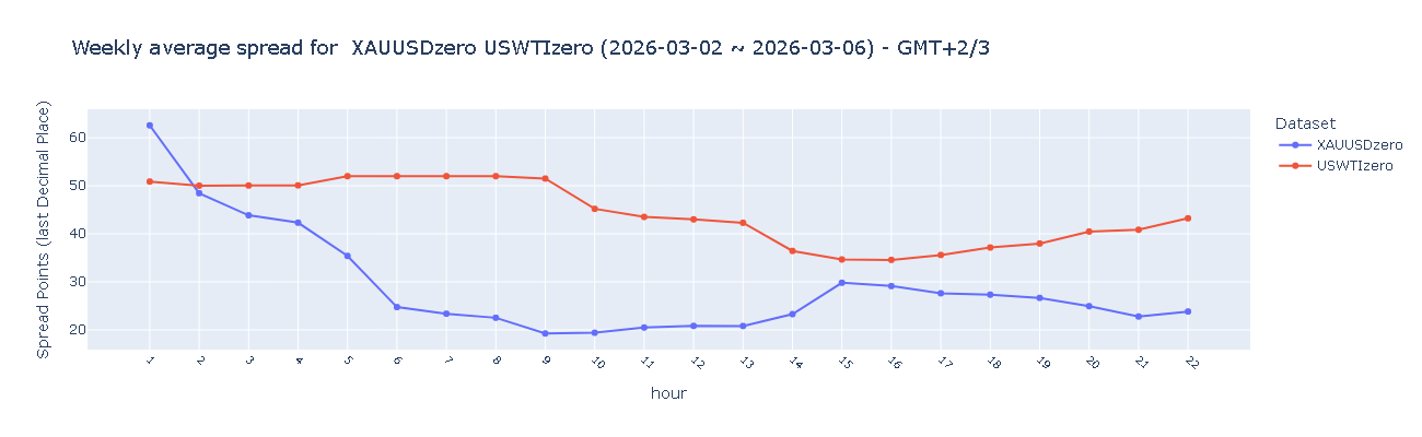 USWTI(美国原油)在欧盘及美盘时段提供"良好"水平(30–40点)的点差,而进入亚盘时段后,受市场流动性收缩影响,点差进一步走阔至"需要改进"水平(>45点)。