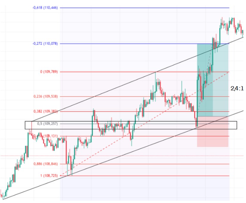 En este ejemplo el precio toca la línea en el nivel 0,5 de Fibonacci, que coincide con la línea de tendencia, y con el soporte trazado (Rectángulo negro)