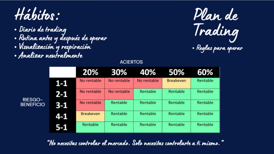 • Mentalidad: Entender que para triunfar en el trading no necesitas acertar todas las operaciones, si no que cuando aciertes las ganancias sean más grandes que las perdidas cuando no.