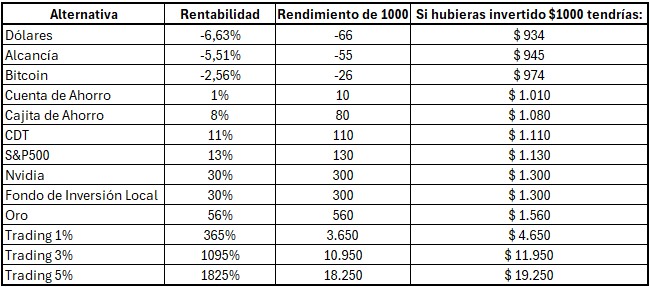 A continuación, un comparativo de las inversiones más comunes en Latinoamérica durante el último año. Te ayudará a entender qué tan competitivo puede ser el trading frente a otros vehículos financieros: