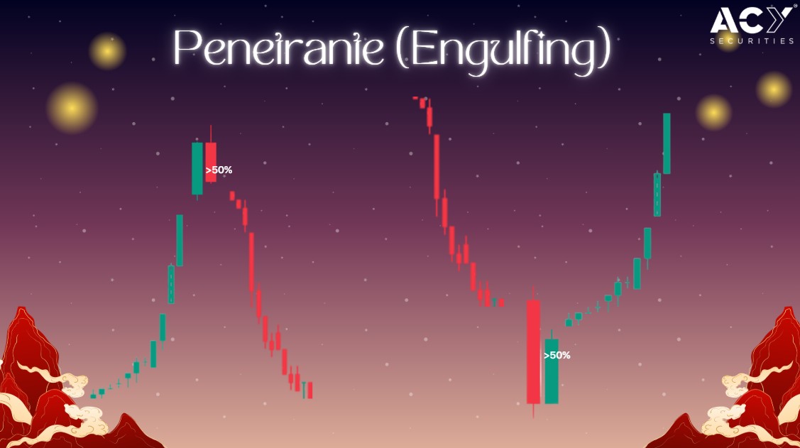 En un máximo o mínimo se forma una vela que revierte el movimiento de la anterior en más de un 50% de su cuerpo
