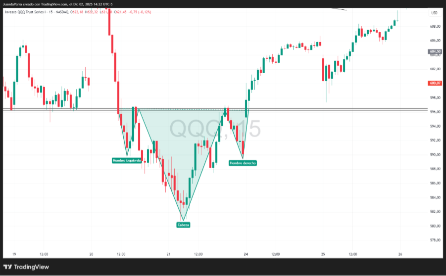 Este patrón es conocido por anticipar posibles reversiones alcistas después de una fase bajista, y aparece con frecuencia en activos como criptomonedas, índices, acciones y ETFs.