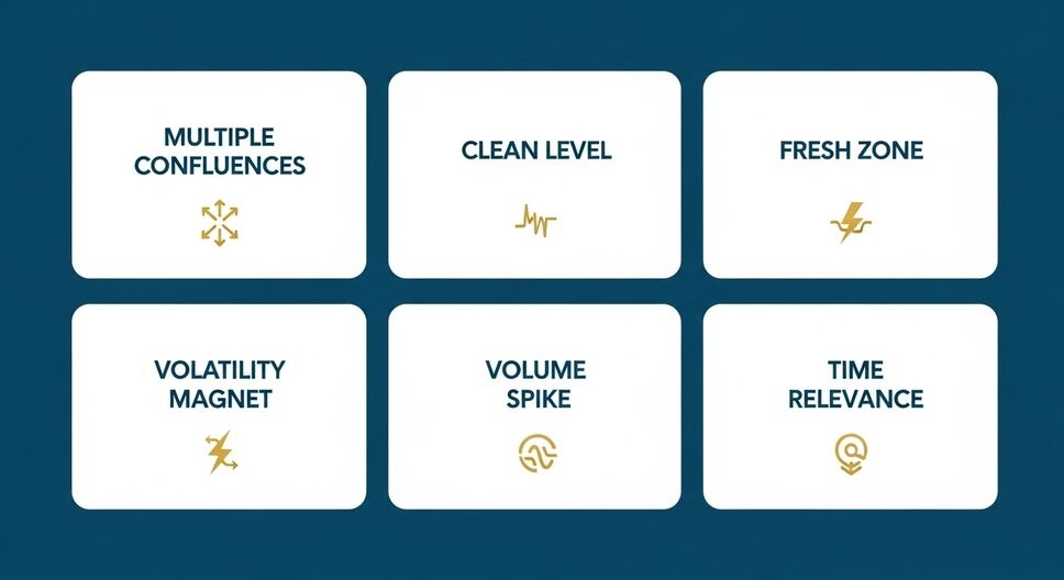 Cuantos más factores se alinean, mejor: confluencia de soportes/resistencias, nivel psicológico, reacción fuerte en el pasado, cercanía a horarios clave (Londres, Nueva York) y presencia de mechas de rechazo o cambios claros de estructura en el precio.