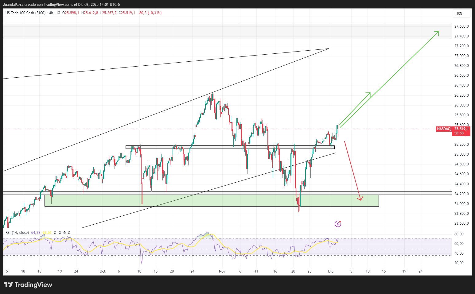 El mercado amaneció con una clara mejora en el apetito por riesgo: tecnología fuerte, criptomonedas en verde y un Nasdaq que empieza a despegarse de su estructura bajista previa. La expectativa de recortes de tasas por parte de la FED continúa dándole combustible al rally, mientras la aparición repetida de patrones de HCH invertidos refuerza la narrativa de posible cambio de tendencia. Sin embargo, en mensual siguen los niveles de sobrecompra, y el fin del rally navideño, los recortes de tasas y la política monetaria de Japón podrían oscurecer el panorama a futuro.