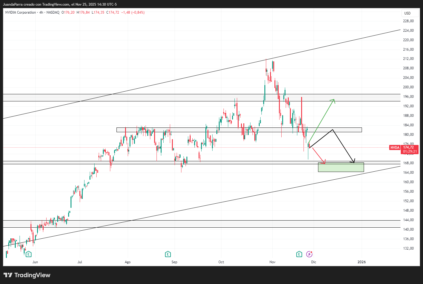 📉  Escenario Bajista:  Sigue bajando hacia los soportes en la zona de 164-168