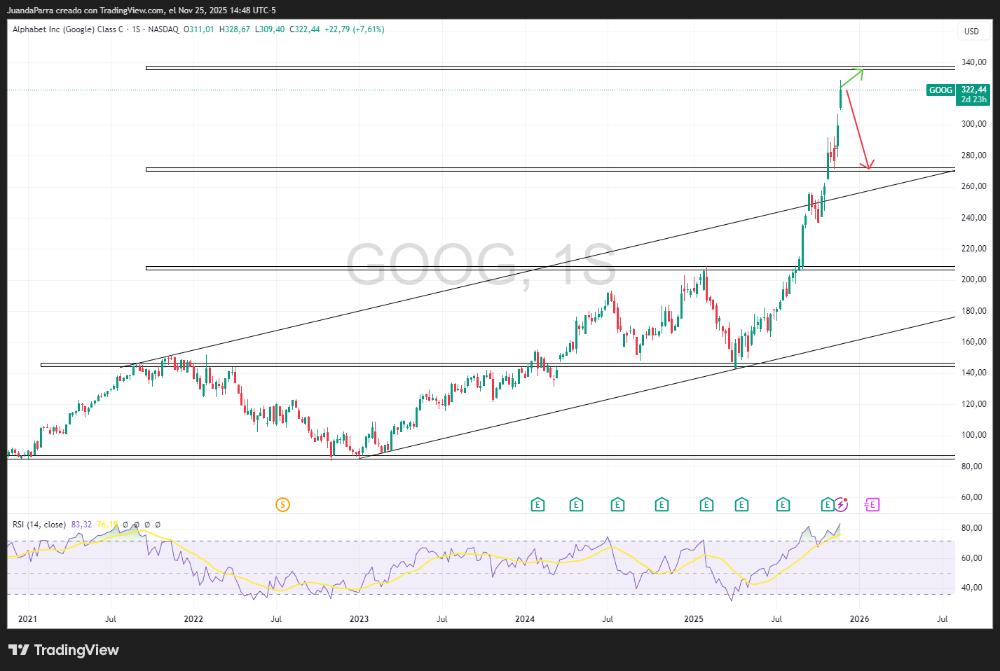Ha tenido una fuerte subida, producto de Warren Buffett entrando en una posición en compra, sus avances en IA con Gemini, y ahora con esta noticia, ha superado el canal alcista y se dirige a la zona de los 340