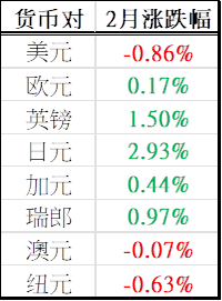 接下来让我们回顾各主要货币在2月份的表现以及相关重要事件,以厘清此前一个月汇市的变化脉络: