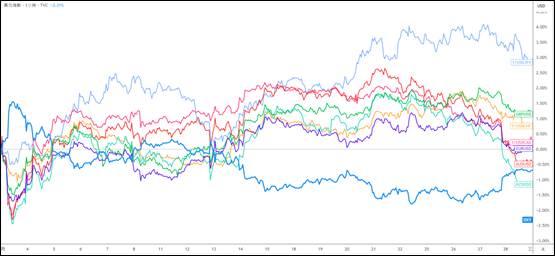 从过去一个月各主要币别的汇率走势图可以发现,美元(DXY,深蓝色线)在2月份的第一个交易日来到高点之后,便开始出现反转,进而一路走弱到月底。日元在2月下半旬异军突起,月度涨幅更曾一度来到4%,另外欧系货币像是英镑、瑞郎也算是表现的前段班,2月中之后还能保持涨幅至月底,至于澳元与纽元则在最后一个交易日多头失守,导致整月收跌。