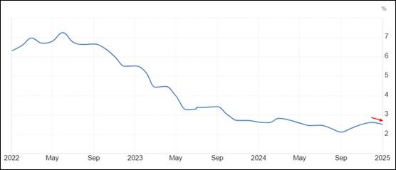 在特朗普的关税威胁下,欧元一度让市场以为将奔向1.0000大关,但随之而来的欧元区CPI似乎有暂缓下降的迹象,另外欧洲最大经济体—德国工厂订单在12月份环比跃升6.9%,超越市场预期的2%;欧元区去年4季度GDP季率增长0.1%,虽然不多,但也超过此前初值0%,以及接近2月中下旬,美国与俄罗斯开始洽谈俄乌停战协议,市场风险偏好情绪回升,欧元也上涨回应。