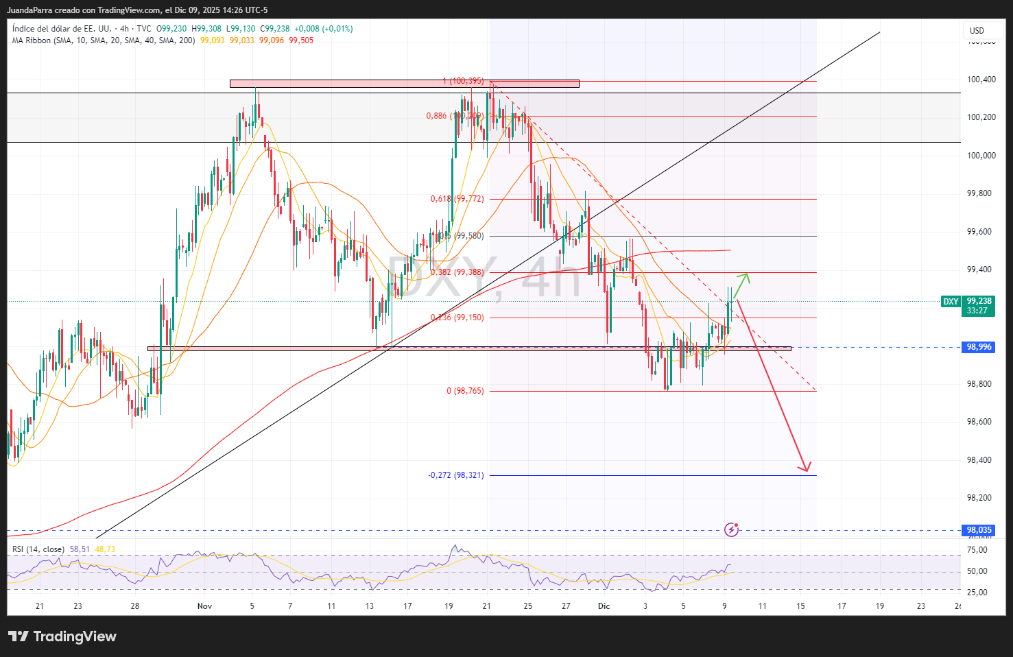 📈  Escenario Alcista: Va a buscar los niveles de 99,400-99,500, o más arriba hasta la línea de tendencia que rompió y probablemente un tercer techo