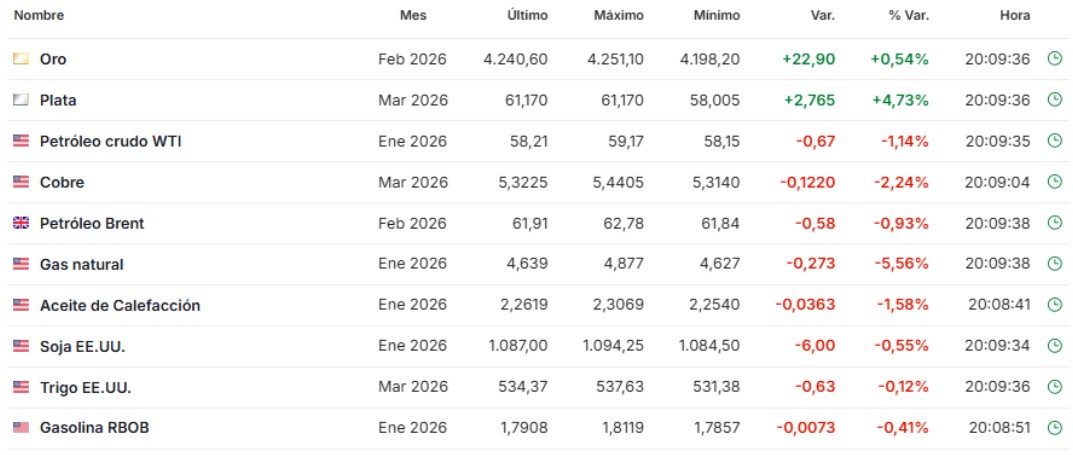 Tenemos caídas en todos, menos en el Oro, con una ligera subida, y a la Plata, con un fuerte impulso alcista