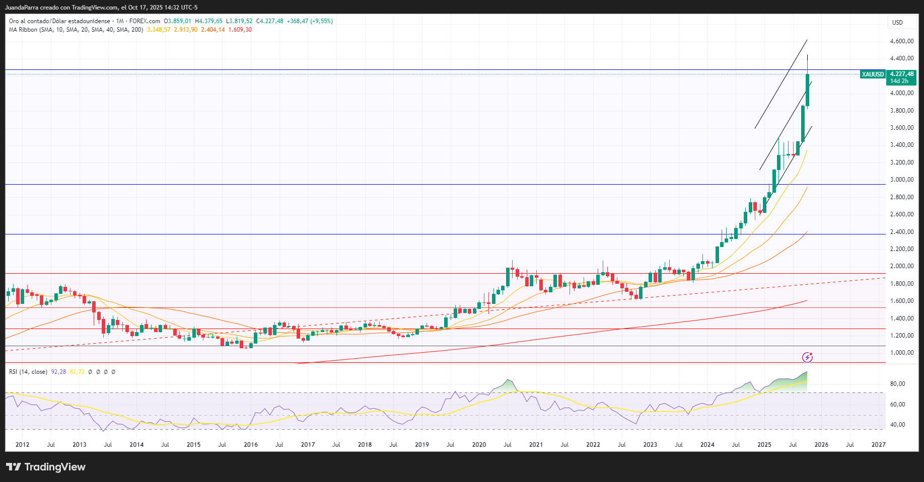 En mensual observamos que alcanzo la extensión de Fibonacci en su nivel –1,414, altos niveles de sobrecompra en el RSI, y alejamiento de las medias móviles, por lo cual podemos esperar un retroceso.