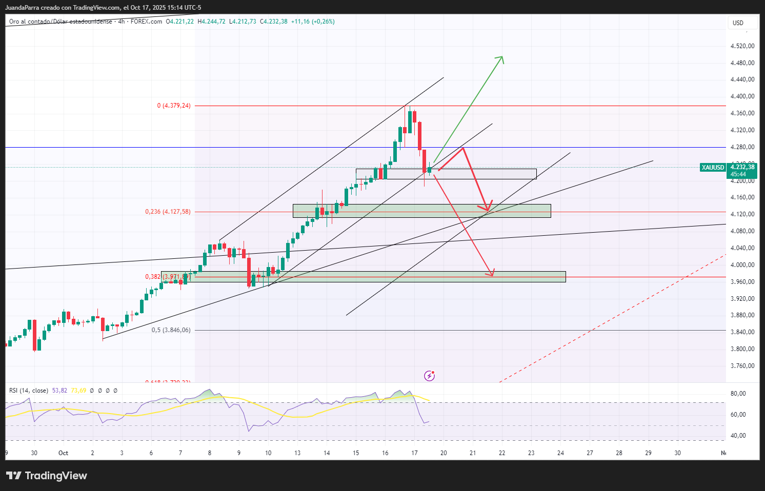 Rebote con continuación de la caída hasta el siguiente piso, y zona de Fibonacci de 0,236 alrededor de los 4120, el que veo más probable debido a la confluencia de la resistencia, la base del canal anterior, y la extensión del canal actual.