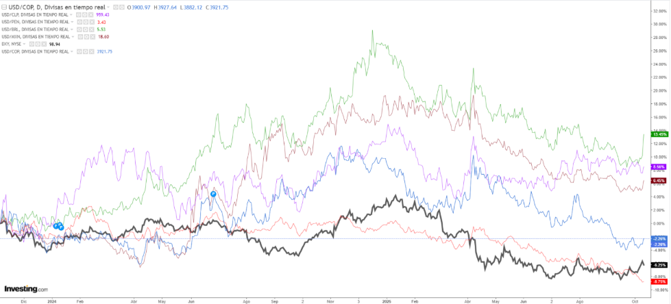 En los siguientes gráficos verás el DXY —la línea negra— comparado con las principales divisas de la región: