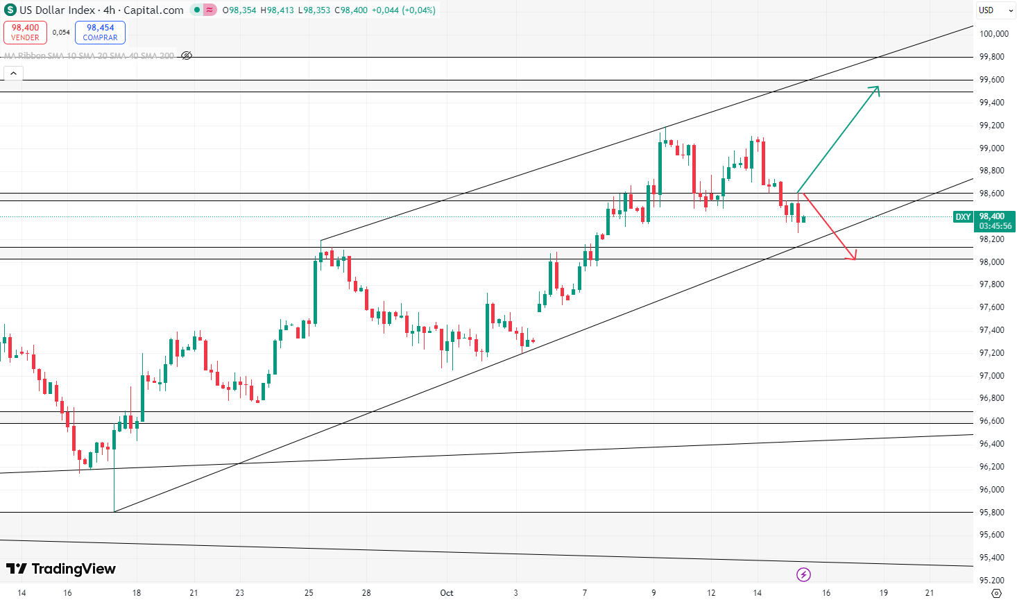 En estos momentos en temporalidad de 4 horas, el Dollar Index se encuentra en un canal alcista, con una aparente formación de doble techo y testeando una zona de resistencia semanal alrededor de los 98,50