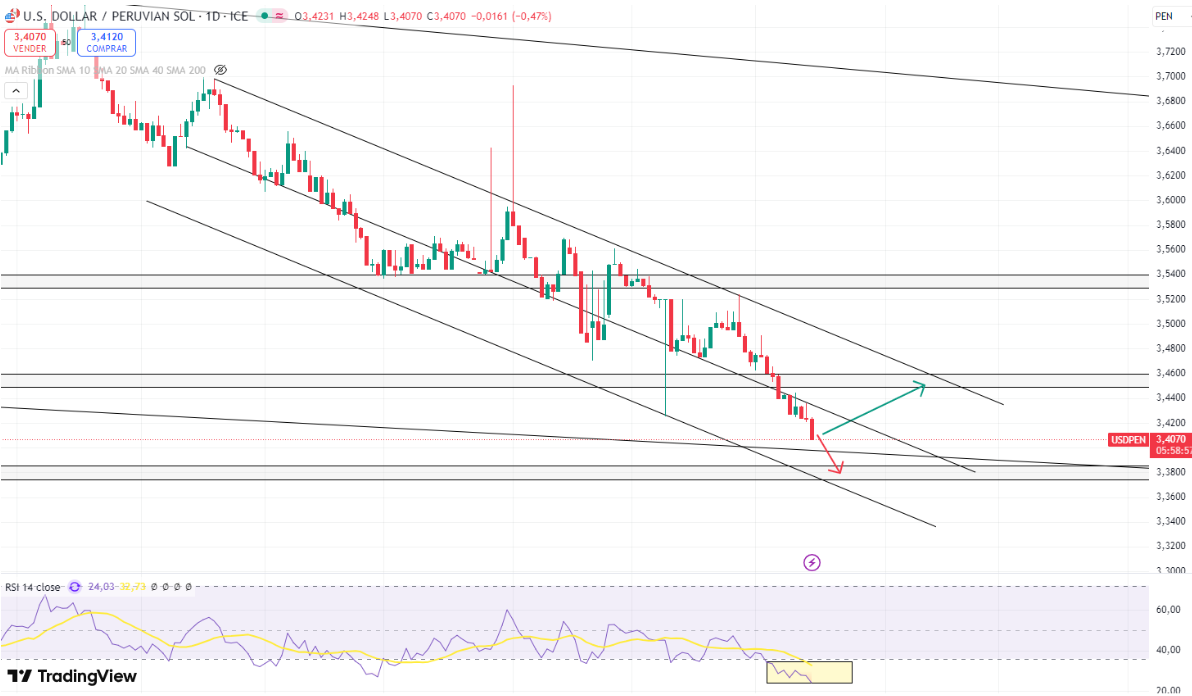 En escenario alcista buscará los 3,45, en bajista 3,38, hay que tener cuidado con los niveles sostenidos de sobreventa, que implican debilidad en el impulso bajista y que probablemente se acerca una correción al alza