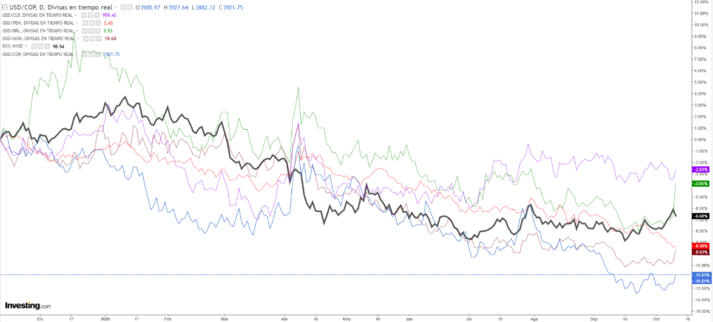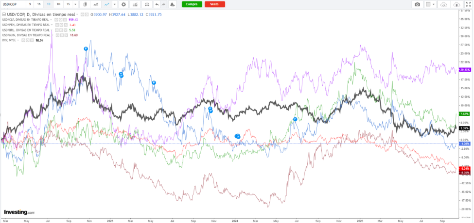 En los siguientes gráficos verás el DXY —la línea negra— comparado con las principales divisas de la región: