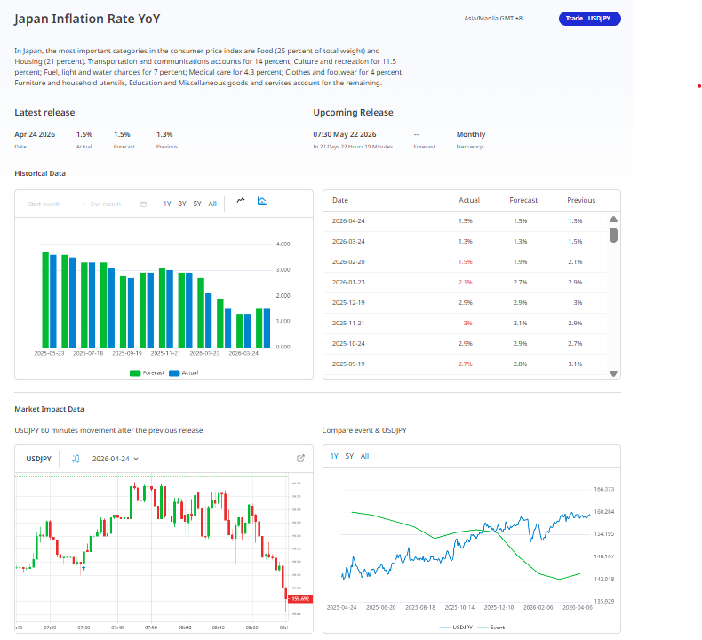 The actual and forecast data. The inflation rate at 1.5% on April 24, 2026. aligned with market expectations and seen with a slight acceleration from the 1.3% recorded in the prior period.