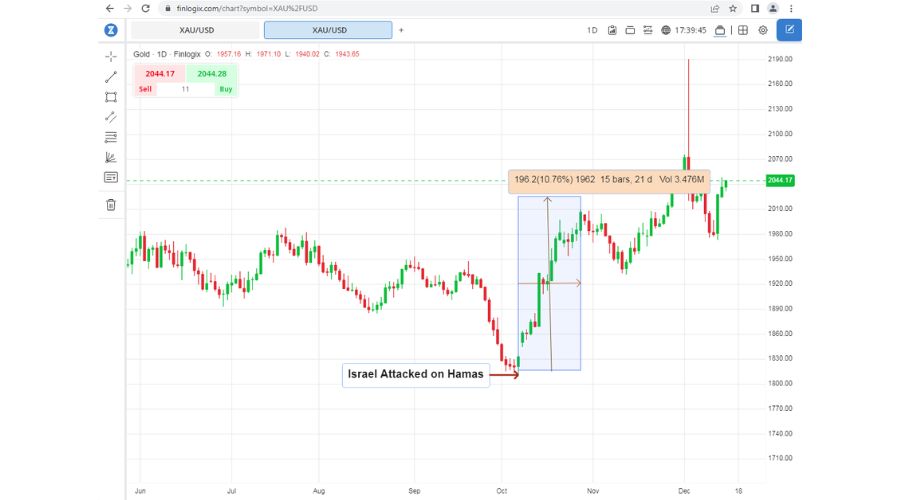 During the initial 20 days of heightened tensions in the Israel-Hamas conflict, gold prices saw gains of around +10%, a clear indicator of its appeal during times of geopolitical instability.