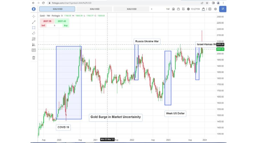 The Israel-Hamas conflict in October exemplified this trend. As tensions escalated, gold began to exhibit bullish behaviour, reinforcing trader confidence in its value as a safe haven. This sentiment is echoed by experts in the field, who suggest that gold could offer substantial benefits in the event of regional conflicts escalating further, potentially impacting oil supply and further driving demand for gold.