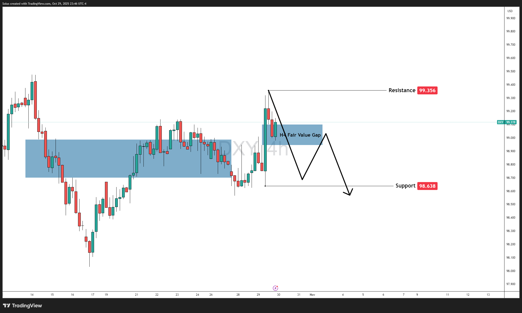 • DXY holds above key support, trading inside a 4H FVG between 98.63–99.35 with a bullish bias.