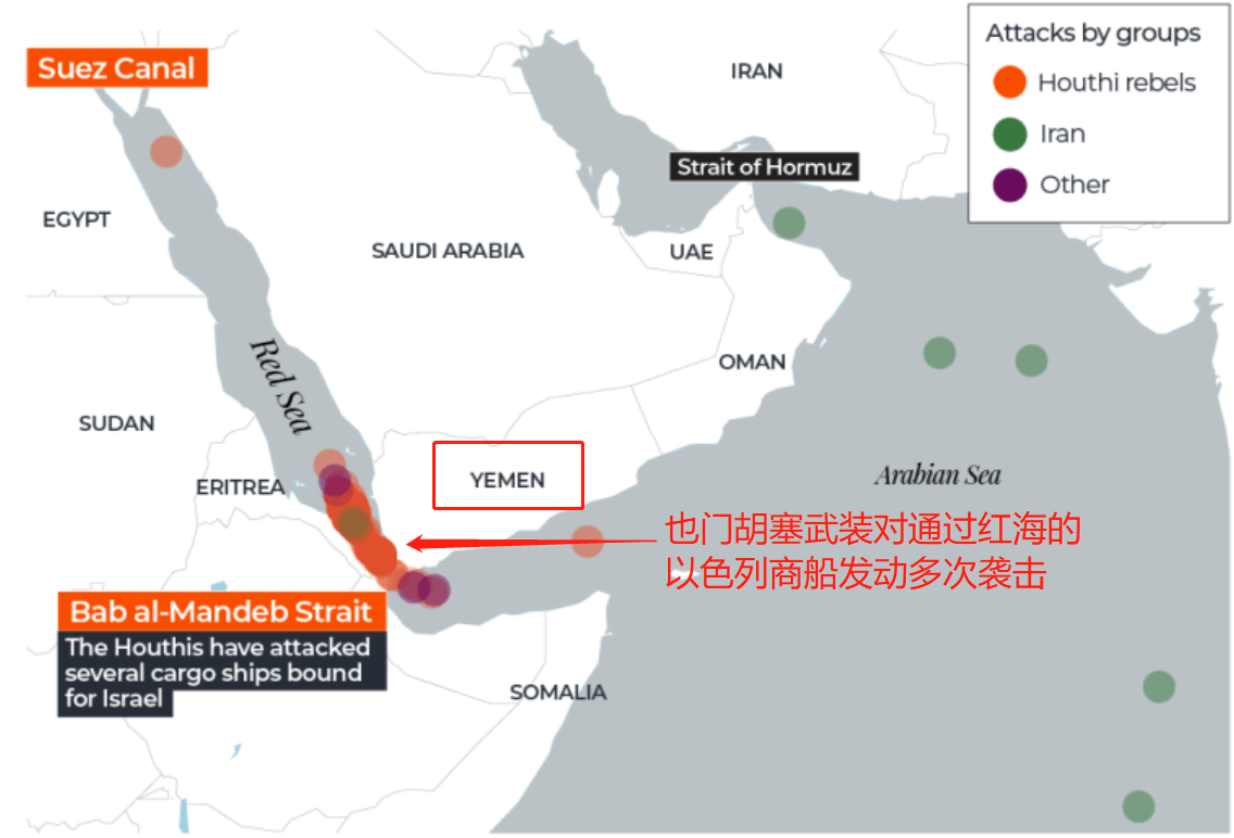 危机的起源是去年10月中旬,也门胡塞武装组织对经过红海的驶往以色列的商船发动了零零散散的袭击。这个胡塞武装自称真主虔信者,崛起于对也门政府的起义,目前控制着也门大部分地区。其背后的金主是伊朗,和叙利亚、巴勒斯坦与黎巴嫩等武装组织结成了反以色列的军事同盟,该同盟也被称为“抵抗轴心”。