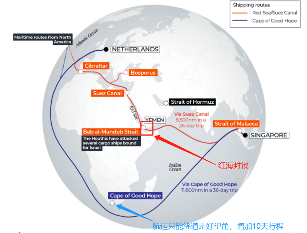首先是因为红海在国际海运上的重要地位。从红海经由苏伊士运河到地中海,这条航线是连接欧亚大陆的重要运输通道。欧亚之间80%的进出口海运走的都是这条航线。因此封锁红海就相当于扼住了欧亚航运的“咽喉”。就拿中国来说,60%驶往欧洲的货轮需要通过红海。一旦红海被封锁,航运就只能绕道走好望角这条航线,这将增加10天的航程,大大提高运输成本。