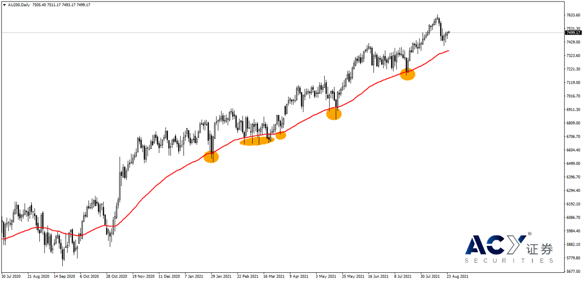 刚刚所说仅是水平的支撑与压力,相对是比较静态与被动的。市场往往时时处于不断博弈的状态,每个人的入场价位都有所不同,因此也衍生出了动态支撑與阻力的观念。动态支撑与压力最常见的应用在移动平均线。 移动平均线又称为均线,代表过去一段时间里的平均成交价格。在一段上升走势中,当价格回落到均线附近时,价格往往停止下跌后并反弹;同样的,在一段下降走势中,当价格反弹到均线附近时,价格往往停止上涨后并下跌。 从图四可看到ASX 200指数日线图从2021年1月以来有9次往下测试EMA-60(指数移动平均线,参数设定60),每当碰触或靠近均线时,价格屡屡开始进行反弹。