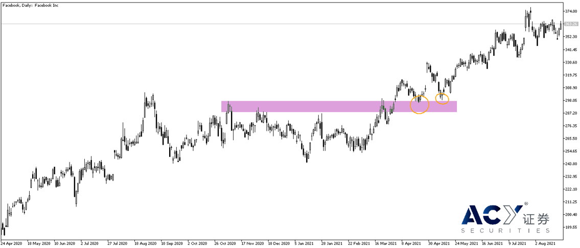 交易突破的话则是运用到之前提及的阻力转支撑,支撑转阻力的知识,如图九,Facebook(脸书)于2021年4/1和4/5突破之前的阻力位之后,原先的阻力已变成支撑,于是可看到4/20~4/23,5/11~5/12价格进行回踩,在这两段时间市场提供了交易者潜在的做多买进机会。